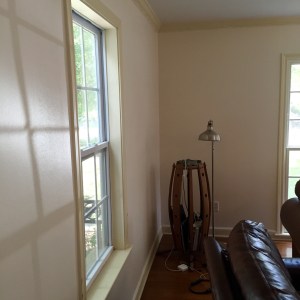 Much relieved, I wiped it on everything and Dan even helped with the crown molding, so I didn’t have to move the ladder around. Then came caulking. Which is actually not that bad… there is something soothing about filling in gaps that makes you feel good. I became a pro caulker, even though I used a whole roll of paper towels on my journey. Finally, taping. Which takes forever. Cue Sunday at 8 pm and I STILL hadn’t painted any of the trim. Which is disheartening when you’ve spent the majority of your weekend “painting” (prepping) the trim.