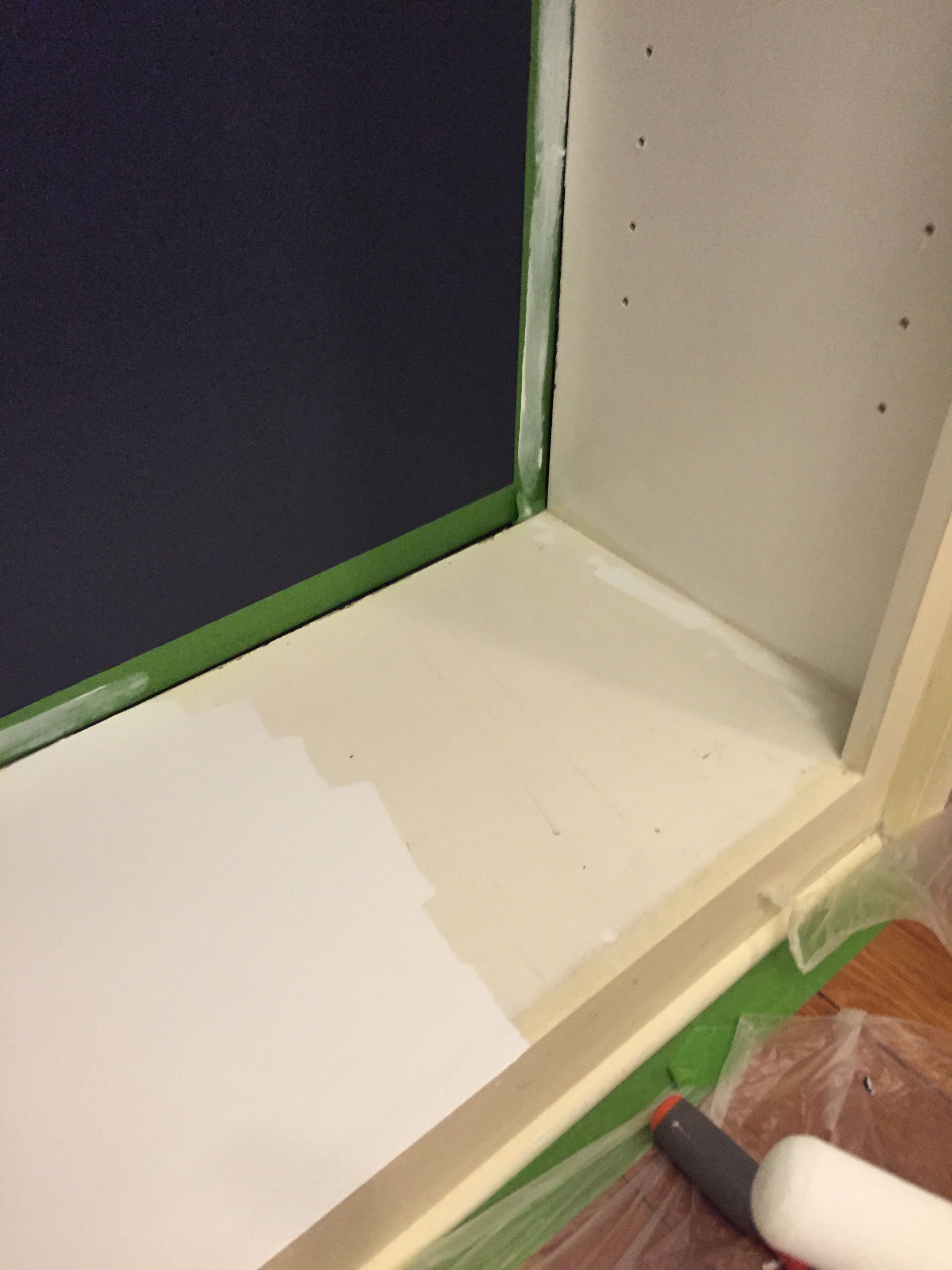 Then Dan swooped in, grabbed a paint brush and just went for it, even on parts I hadn’t taped. It made me both incredibly grateful, but also, WHAT at the same time. Why had I spent so much time taping?!?! Word of advice- just learn how to paint without having to tape. It’s all in the brush angle. It also helped that the trim and walls are 2 very similar shades of white… 🙂 We went with White Dove by Benjamin Moore in semi-gloss for the trim and Hale Navy in eggshell for the backs of the bookshelves.