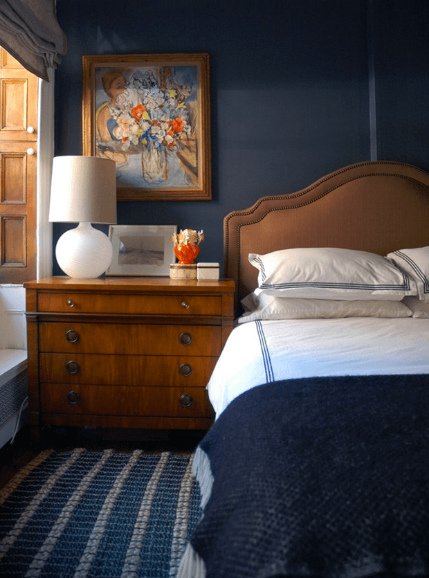 Since we didn’t end up putting in navy kitchen cabinets, I still have an itch to have it in a big way. Now I’m thinking about covering our entire bedroom. Even though it has 4 windows, it doesn’t get a ton of natural light and I’m not sure how it would look with our dark & heavy furniture. But I am loving the idea of it and feeling adventurous, especially after painting the rest of the house in white and gray (and trying to block out how much I hate painting). Maybe we could just do one wall navy, and the rest white? Are accent walls still in? Anyway, check out these rooms: