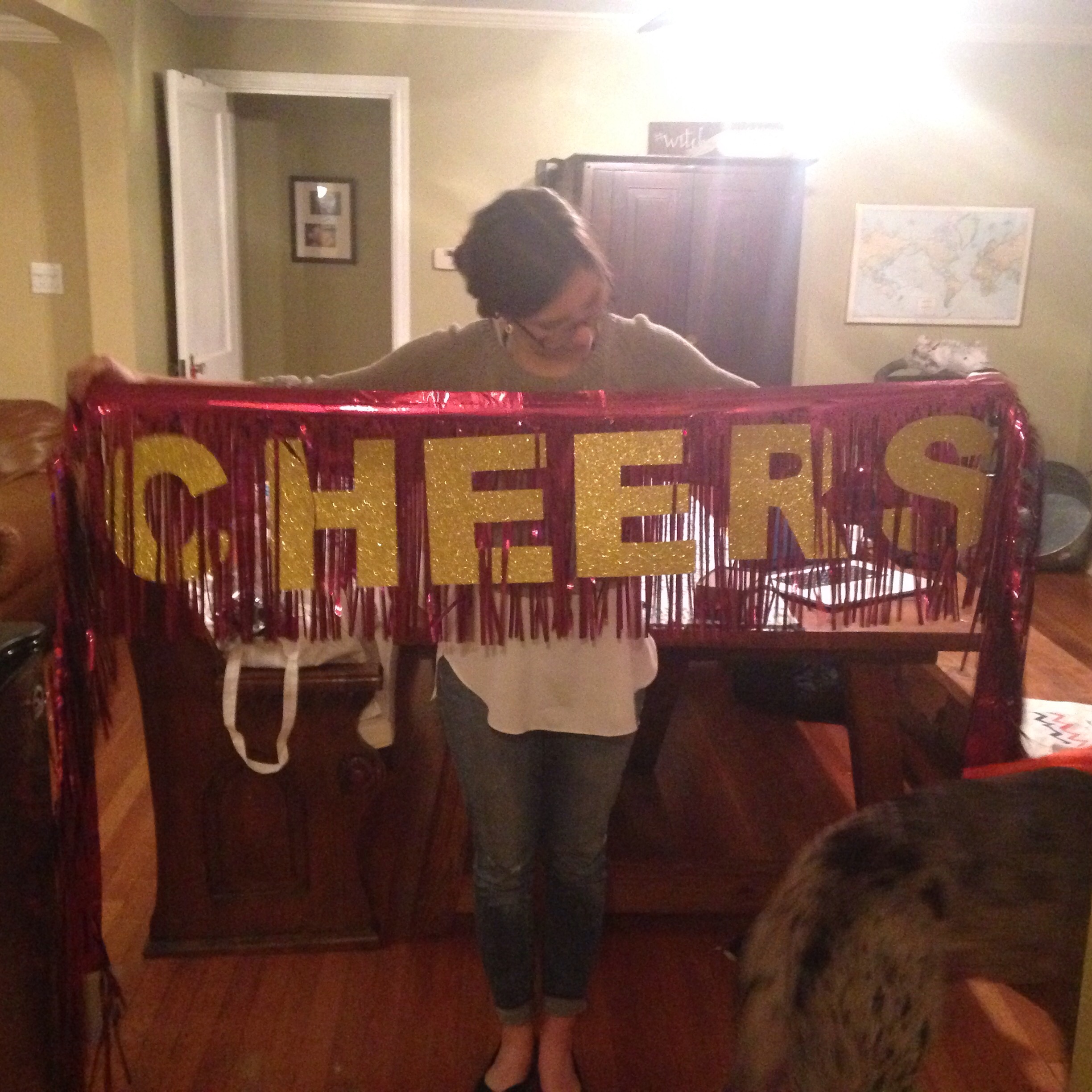 Chels came Friday from Austin and we crafted and shopped and ate grocery store sushi. I baked the cutest cookies ever- insanely easy recipe, incredibly tedious put together process. The dough as sticky and making tiny cookies is challenging. While they didn’t turn perfect, I was pretty proud of them. As far as crafting, I had seen an adorable “Cheers” sign for sale on Etsy for $50 and figured it’d be worth it to attempt to make it on our own. It definitely was.